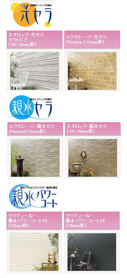 光触媒で「壁の防汚」と「大気浄化」を実現する光セラ。天然石さながらの風合いやナチュラルなデザインを取り入れた高品質・高寿命なセラミックコートシリーズなど多様な外壁材からお選び下さい。